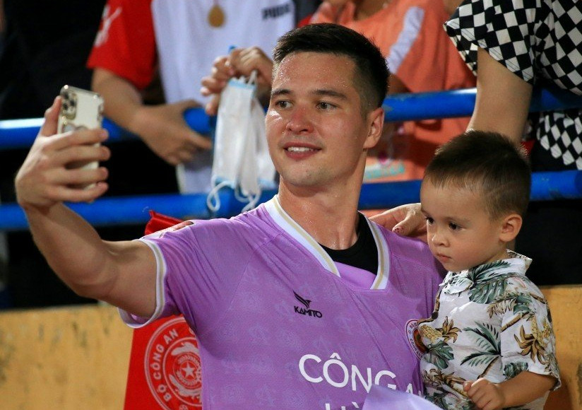 Trong lúc các thành viên khác của CLB Công an Hà Nội hân hoan trên bục nhận huy chương V-League 2023, Filip Nguyễn hướng sự tập trung về đám đông khán giả phía xa. Ngay sau khi đại diện đội bóng nhận cúp, thủ môn sinh năm 1992 chạy ra ngoài, sốt sắng tìm vợ con chia vui.