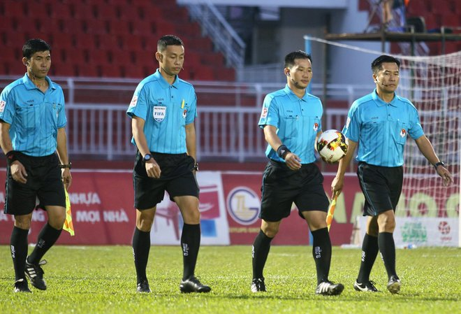 Trọng tài Trần Đình Thịnh (cầm bóng) bị phê bình vì chưa phối hợp khéo léo. Ông Thịnh được phân công làm trọng tài thứ 4 trên sân Vinh ở vòng 3. (Ảnh: Quang Thịnh)