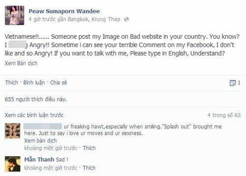Hot girl Thái Lan Peaw Sumaporn Wandee thậm chí yêu cầu người dùng Viêt Nam sử dụng... tiếng Anh thay cho tiếng Việt khi trao đổi, giao tiếp.