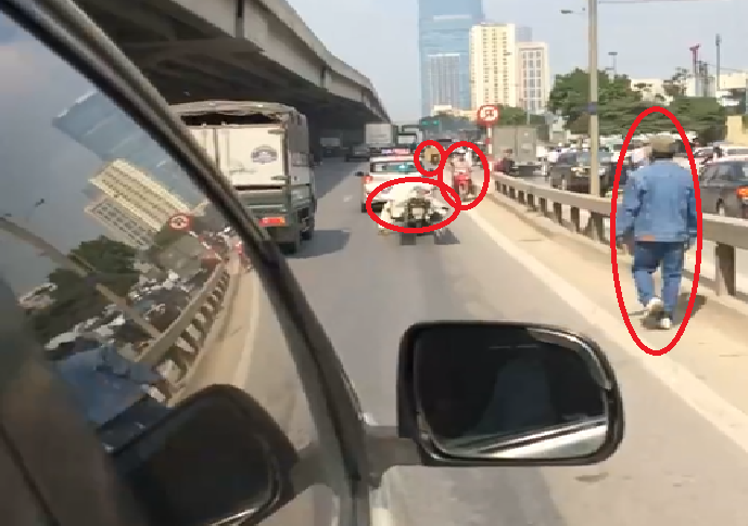 Mặc dù đã có biển báo và quy định về việc cấm một số phương tiện và người đi bộ lên xuống đường trên cao, nhưng những người xuất hiện trong đoạn video trên vẫn ngang nhiên vi phạm mà không quan tâm đến sự nguy hiểm của mình cũng như các phương tiện khác đang lưu thông.