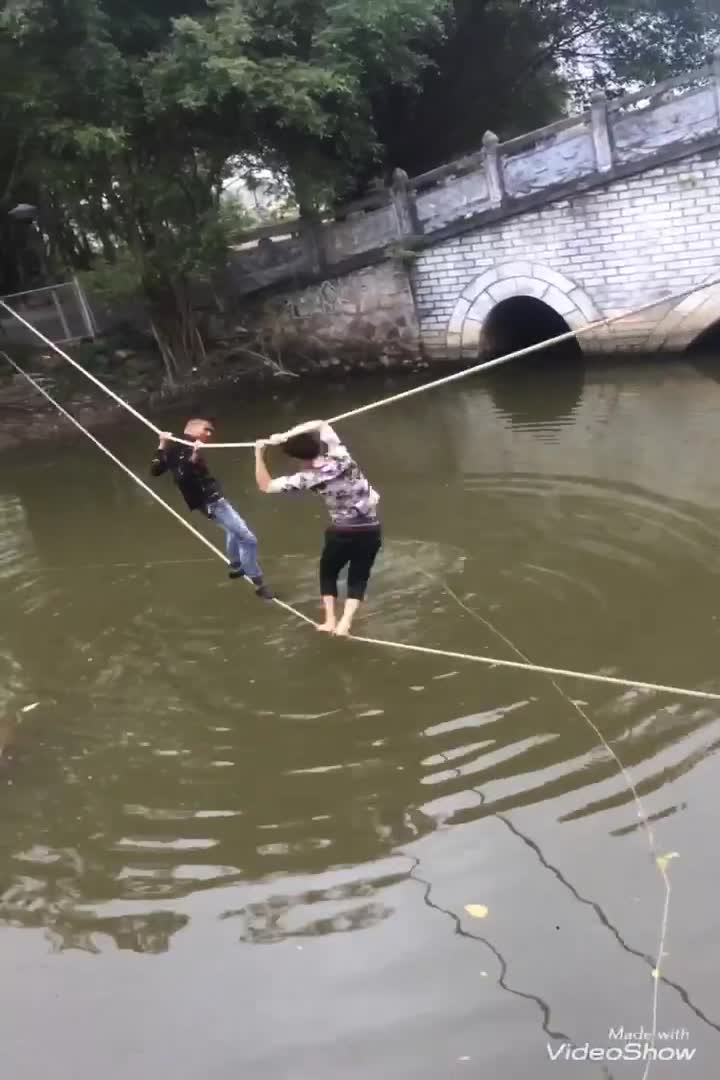 Clip ghi lại cảnh 2 nam thanh niên vắt vẻo, chật vật bám dây thừng để qua sông khiến dân mạng cười nghiêng ngả, thu hút hàng chục nghìn lượt thích và chia sẻ trên Facebook.