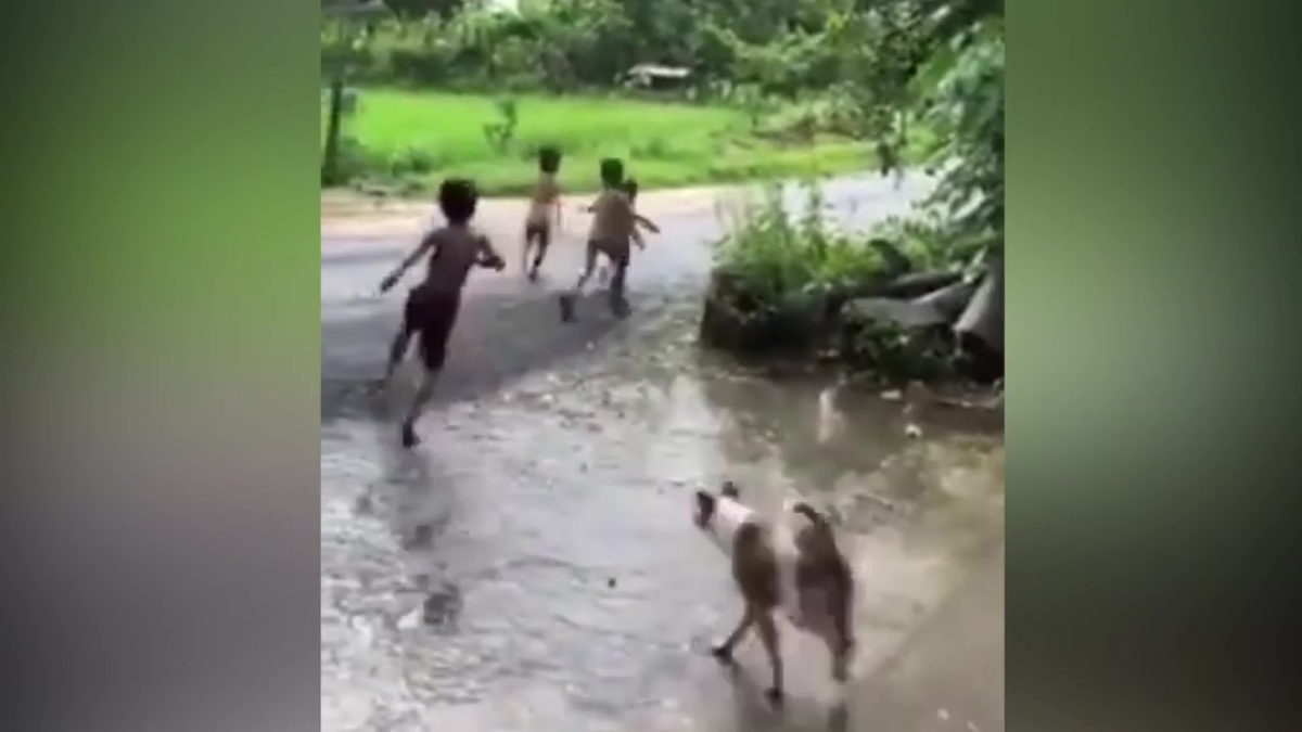 Bắt chước tiếng sủa để trêu chó, bốn cậu bé chạy thục mạng khi chú chó thoát được ra ngoài và đuổi theo.