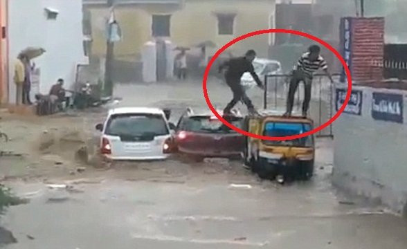 4 người đàn ông ở TP Haldwani (bang Uttaranchal, Ấn Độ) kịp thời trèo ra khỏi ô tô của mình chỉ vài giây trước khi những chiếc xe bị lũ cuốn phăng.