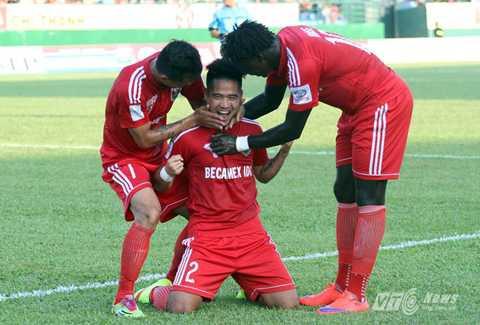 Hậu vệ Âu Văn Hoàn của B.Bình Dương dễ dàng nâng tỷ số lên 2-0 cho đội chủ nhà sau một pha băng vào đệm lòng cận thành.