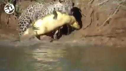 (VTC News) - Báo đốm đứng trên bờ quan sát cá sấu một lúc rồi nhanh như chớp tóm lấy con mồi xấu số chỉ bằng một cú đớp.