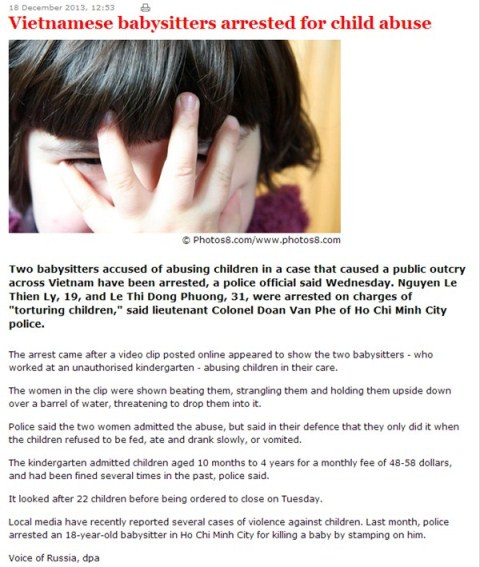 | Voice of Russia với tiêu đề "Bảo mẫu Việt Nam bị bắt vì bạo hành trẻ nhỏ" |
