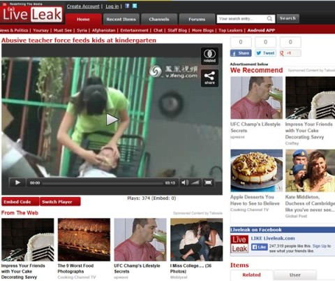 | Trên trang Liveleak đã cho đăng tải đoạn clip này với tiêu đề "Abusive teacher force feeds kids at kindergarten" (Tạm dịch: Cô giáo hành hạ, ép trẻ ăn tại trường mầm non). |