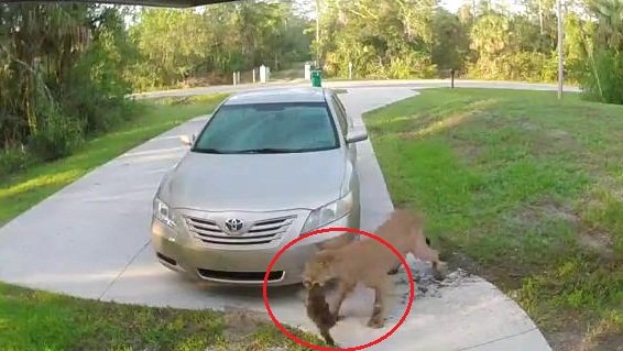 Báo sư tử truy sát, ngoạm xác mèo rồi bỏ đi ngay trước hiên một ngôi nhà nằm ở ngoại ô thành phố Naples, (bang Florida, Mỹ), khu vực nhiều loài động vật hoang dã như gấu, báo thường xuyên đi lang thang.