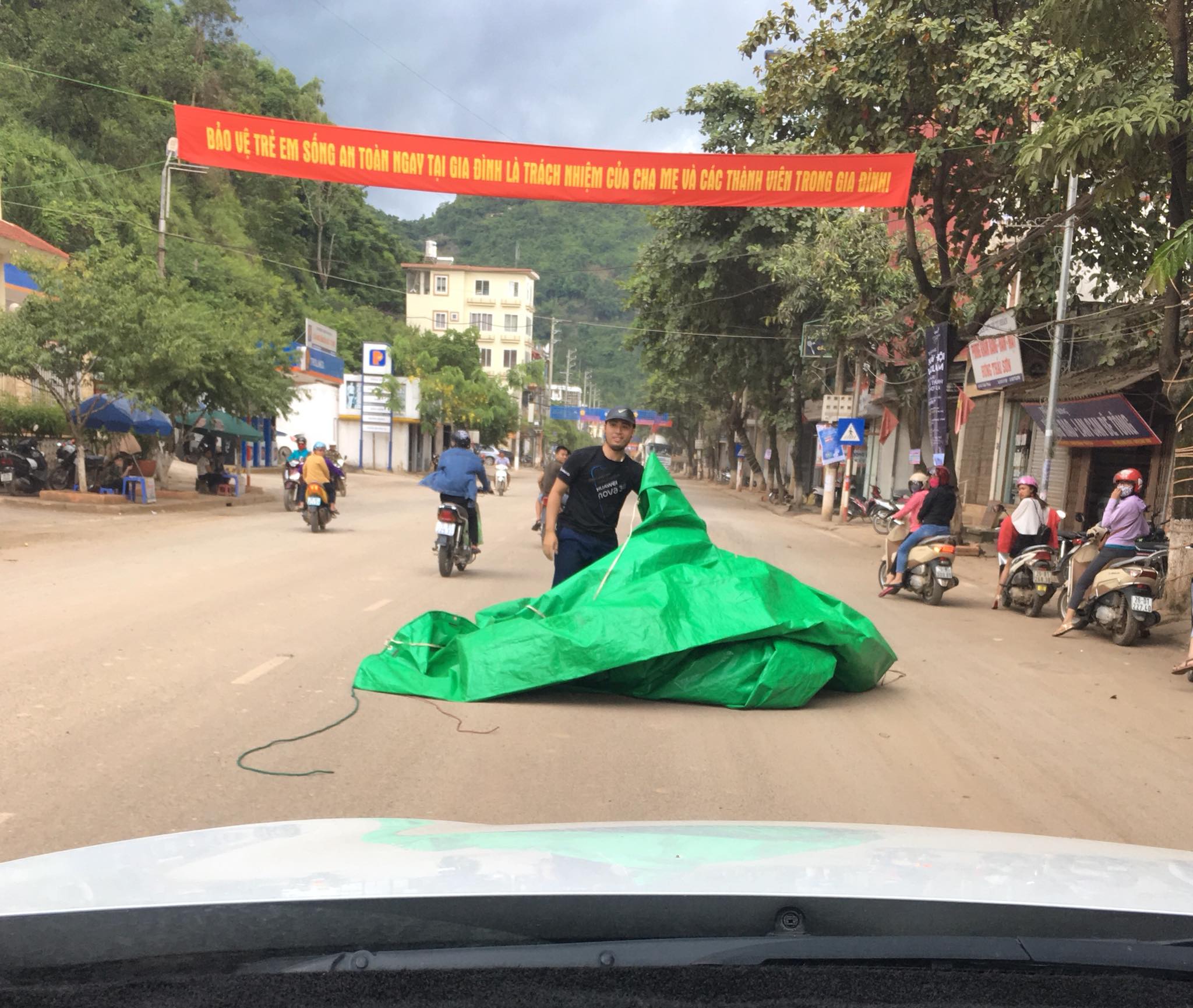 Đoạn clip được chia sẻ trên mạng xã hội facebook, ghi lại cảnh một người đàn ông đi xe máy đang di chuyển trên đường bị trùm gọn bởi một tấm bạt phủ màu xanh bay từ móc ô tô tải xuống. Rất may khi đó người này đi rất chậm nên chỉ bị ngã mà không gặp phải thương tích gì.