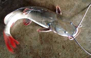 Để bắt được 1 con cá lăng đuôi đỏ nặng 20 kg, một người dân đã phải bám trụ cần câu khoảng 30 phút mới đưa được cá lên bờ.