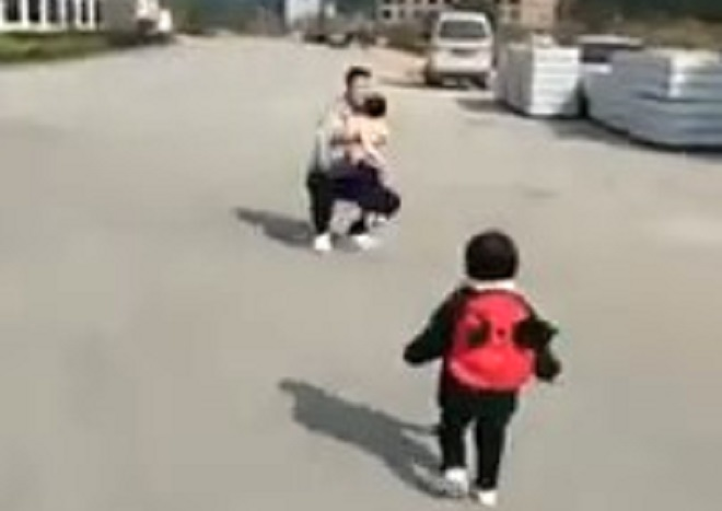 Đang lẽo đẽo chạy theo bố thì nhìn thấy bố bế một bạn nhỏ khác, bé gái thất vọng đến nỗi ngã quỵ xuống đất vì buồn tủi.