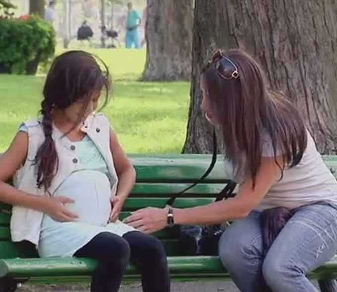 Bé gái mới chỉ tầm 11, 12 tuổi thản nhiên ngồi xoa bụng bầu trên ghế đá công viên khiến nhiều người lớn tròn mắt kinh ngạc.