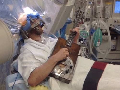 Ngày 23-5, anh Brad Carter (39 tuổi) đã được quay lại cảnh hào hứng chơi đàn guitar trong lúc các bác sĩ tại Bệnh viện Đại học Đại học California-Los Angeles (UCLA) miệt mài cấy thiết bị kích thích não sâu (DBS).