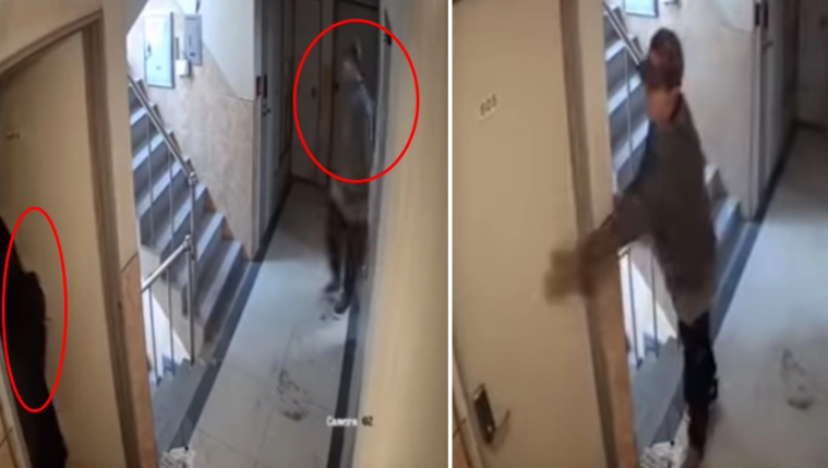 Khi cô gái đứng mở cửa nhà, gã đàn ông biến thái âm thầm rình rập phía sau, chỉ chực đợi thời cơ vồ lấy “con mồi” của mình.