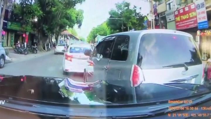 Do xảy ra va chạm nhẹ vào đuôi xe Innova đi ẩu ở đường Nguyễn Thái Học (Hà Nội), tài xế xe phía sau bị bắt đền 2 triệu.