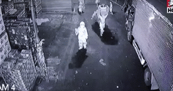 Đoạn video ghi lại cảnh một đoàn múa lân đang tiến vào ngõ và phát hiện 2 chú chó đang rượt đuổi, khiến cả nhóm tháo chạy tán loạn.