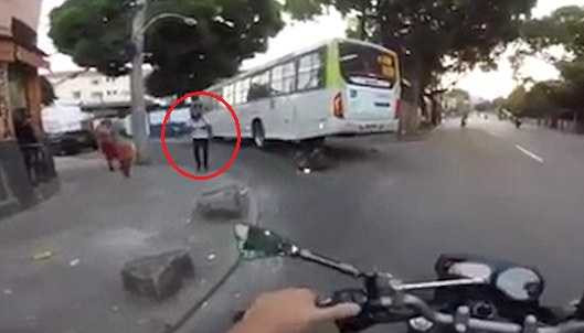 Xe máy tăng tốc cố vượt xe buýt tại giao lộ, bị húc ngã văng ra đường; sau khi bị nuốt chửng dưới gầm xe buýt, người lái xe máy lồm cồm bò dậy như chưa từng xảy ra chuyện gì.