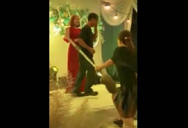 Clip: Bị vợ cầm chổi đánh vì mải 'đu đưa' trong đám cưới
