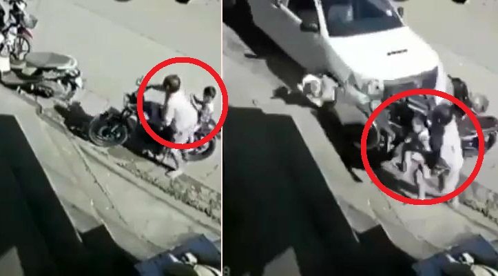 Người bố phản xạ nhanh như cắt, ôm con nhảy ra khỏi xe máy chỉ trong tích tắc trước khi ô tô lao tới.