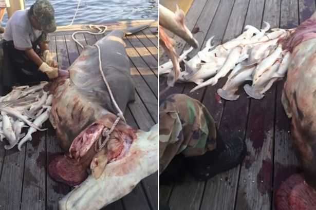Con cá mập đầu búa được đưa lên thuyền khi đã chết, sau đó là cảnh tượng đau lòng khi một ngư dân mổ bụng nó và lôi ra 34 cá mập con.