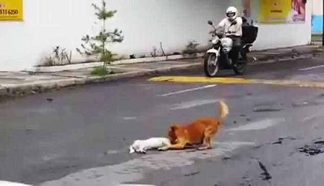 (VTC News) - Chú chó dũng cảm lao ra đường, cố gắng kéo người bạn của mình vào sau khi bị một chiếc xe đâm phải.