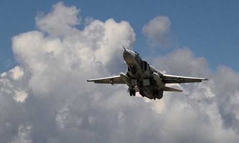 Tổ lái Su-24M của Nga thực hiện việc tiếp nhiên liệu trên không trong khi thực hiên các chuyến bay tập ở khu vực Kaliningrad.