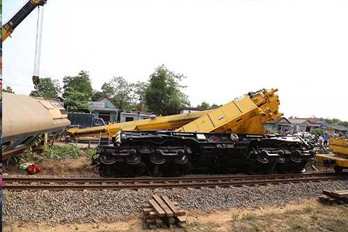 Cần trục cứu hộ của đường sắt Việt Nam khi chuẩn bị cẩu toa tàu trật bánh sau tại khiến lái tàu tử vong, đã bị lật, gây thêm khó khăn trong việc giải tỏa, thông