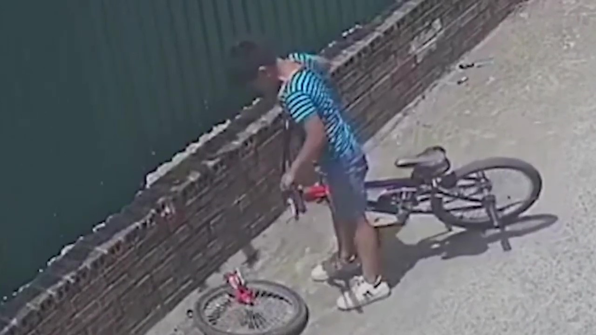 Đang thể hiện năng lực "quái xế", cậu bé không làm chủ được tay lái, liền đâm vào tường khiến chiếc xe đạp gãy đôi.