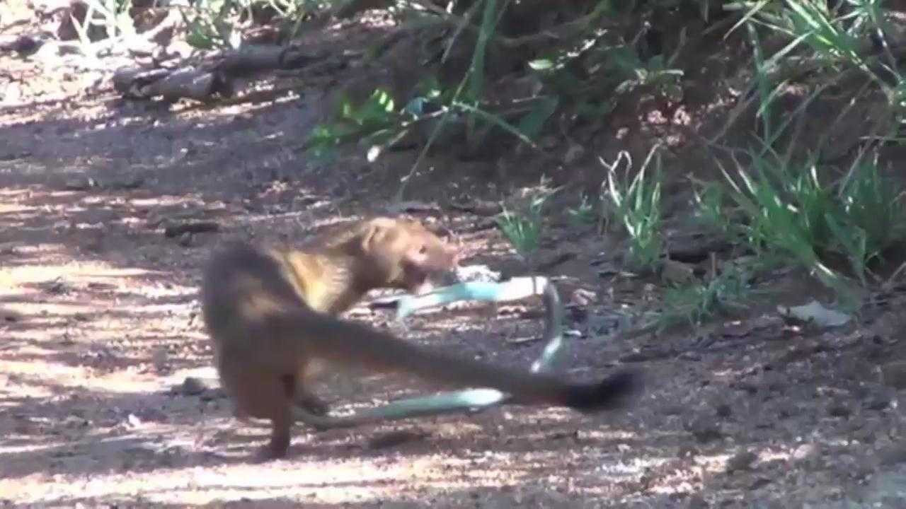 Con rắn Mamba đen tung những cú mổ chí mạng về phía cầy mangut, song khả năng di chuyển nhanh giúp con cầy tránh mọi đòn tấn công của đối thủ.