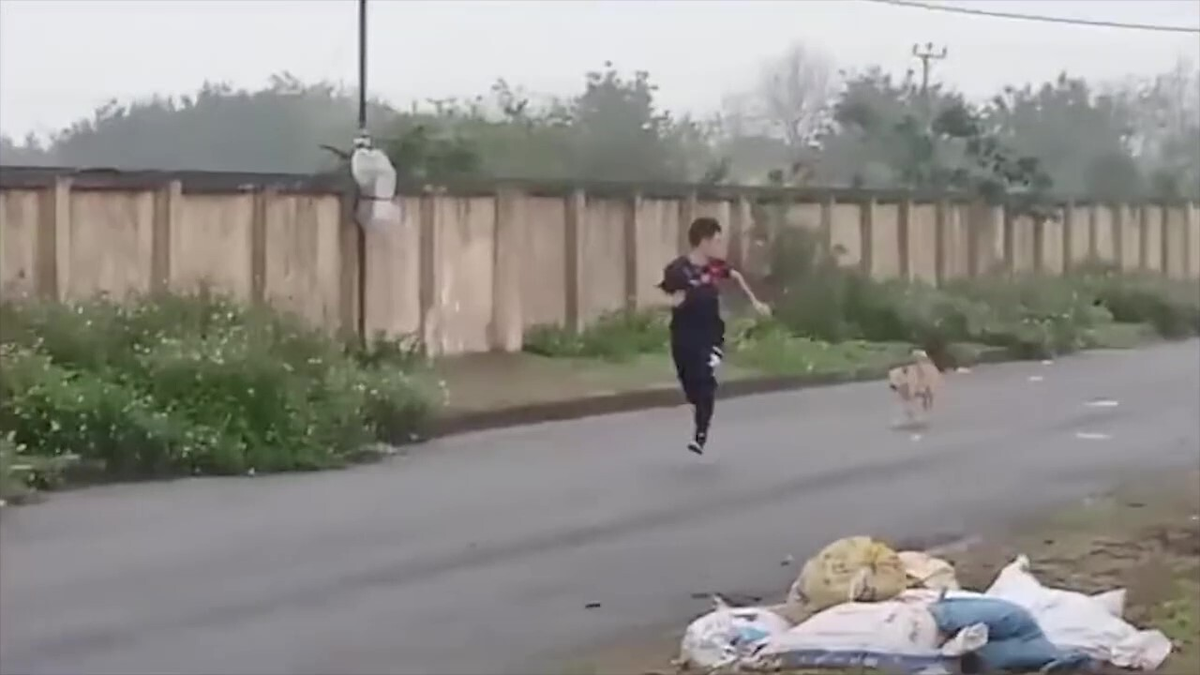 Bày trò trêu chó mà như tham gia màn thể thao mạo hiểm, đây có vẻ là cách để rèn luyện thể lực của chàng trai.