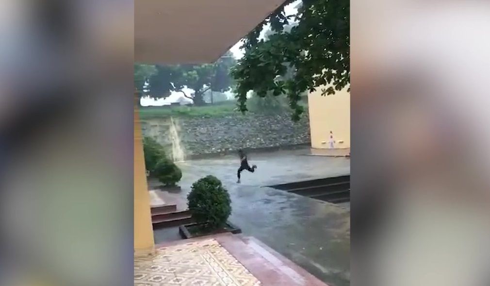 Clip: Chàng trai ngã như xiếc khi chạy trú mưa
