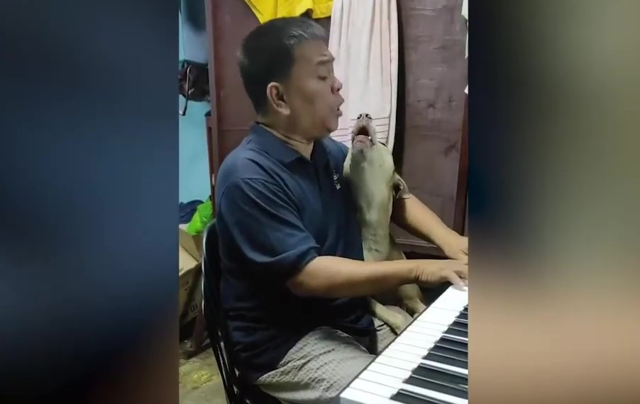 Trong tiếng đàn piano của chú, chú chó ngửa cổ "hát" thật say đắm và du dương.