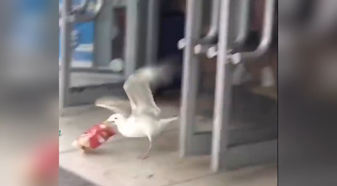 Ra vẻ thong dong đi vào cửa hàng, chú chim lấy trộm bịch đồ ăn rồi chạy vút đi, nhân viên cửa hàng đuổi không kịp.