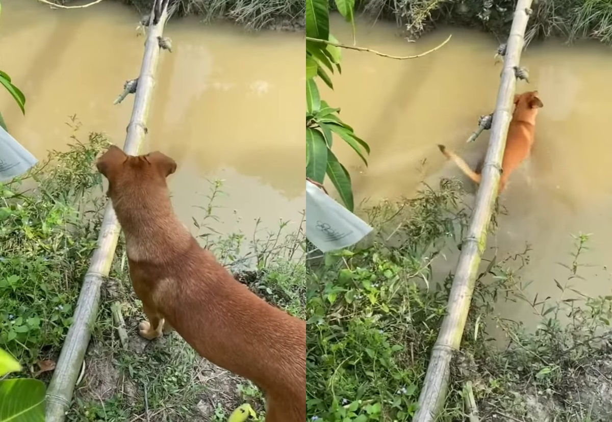 Để hướng dẫn chó vàng cách qua mương trên chiếc cầu bằng cây tre, chó đen đi một lượt làm mẫu, và rồi chó vàng..., các bạn xem clip sẽ biết.