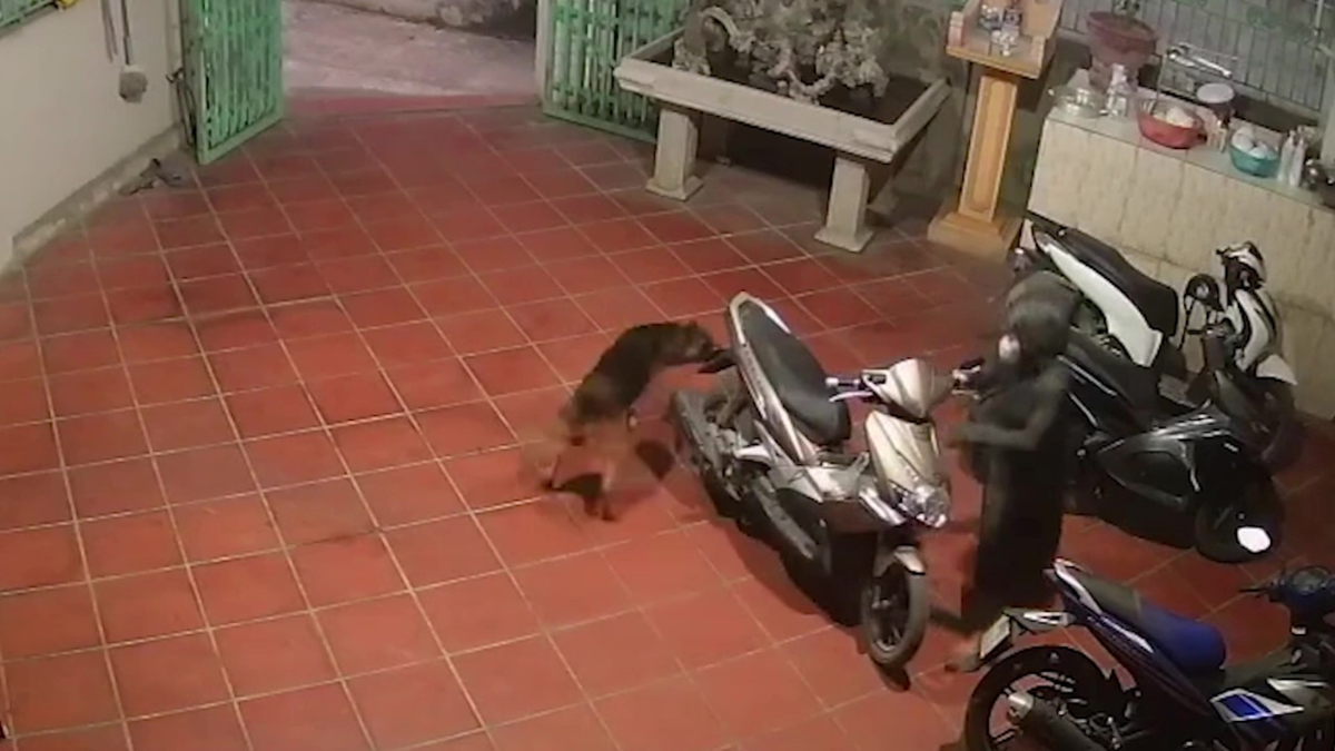 Thấy cô gái lạ phóng xe máy vào sân, chú chó xông ra vừa hung hăng sủa vừa đuổi, cô gái sợ cuống cuồng chạy quanh chiếc xe máy.