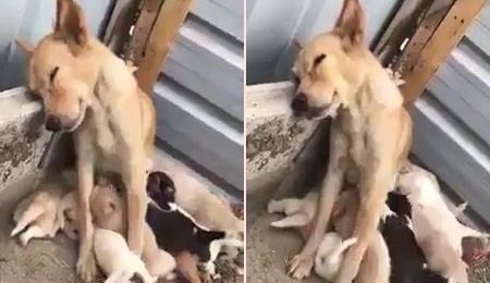 Hình ảnh phờ phạc của chó mẹ khi chăm sóc đàn con thơ khát sữa khiến người xem vừa thương, vừa buồn cười.