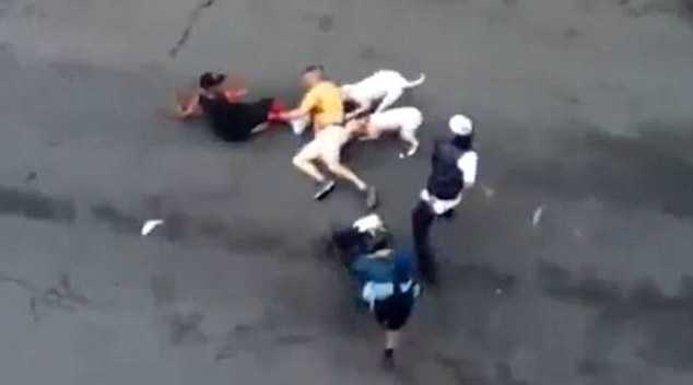 Cảnh quay gây sốc từ một căn hộ trên cao cho thấy người đàn ông bị 2 con pitbull kéo lê và hung hãn cắn xé trên phố.