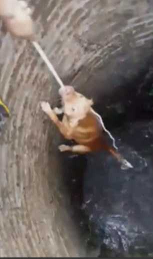 (VTC News) - Sau nhiều lần sắp lên đến thành giếng lại bị rơi xuống, con vật thông minh vẫn cố gắng cắn chặt vào sợi dây để người kéo lên và nó đã thoát chết một cách ngoạn mục.