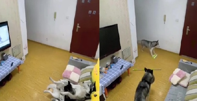 Phát hiện chủ về, chú chó Husky vội dậy tắt tivi và lôi dụng cụ ra làm việc nhà để qua mặt chủ.
