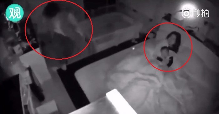Camera giám sát trong nhà ghi lại hình ảnh cho thấy người chồng ngồi làm việc bên máy tính, người vợ và đứa con nhỏ đang say giấc.