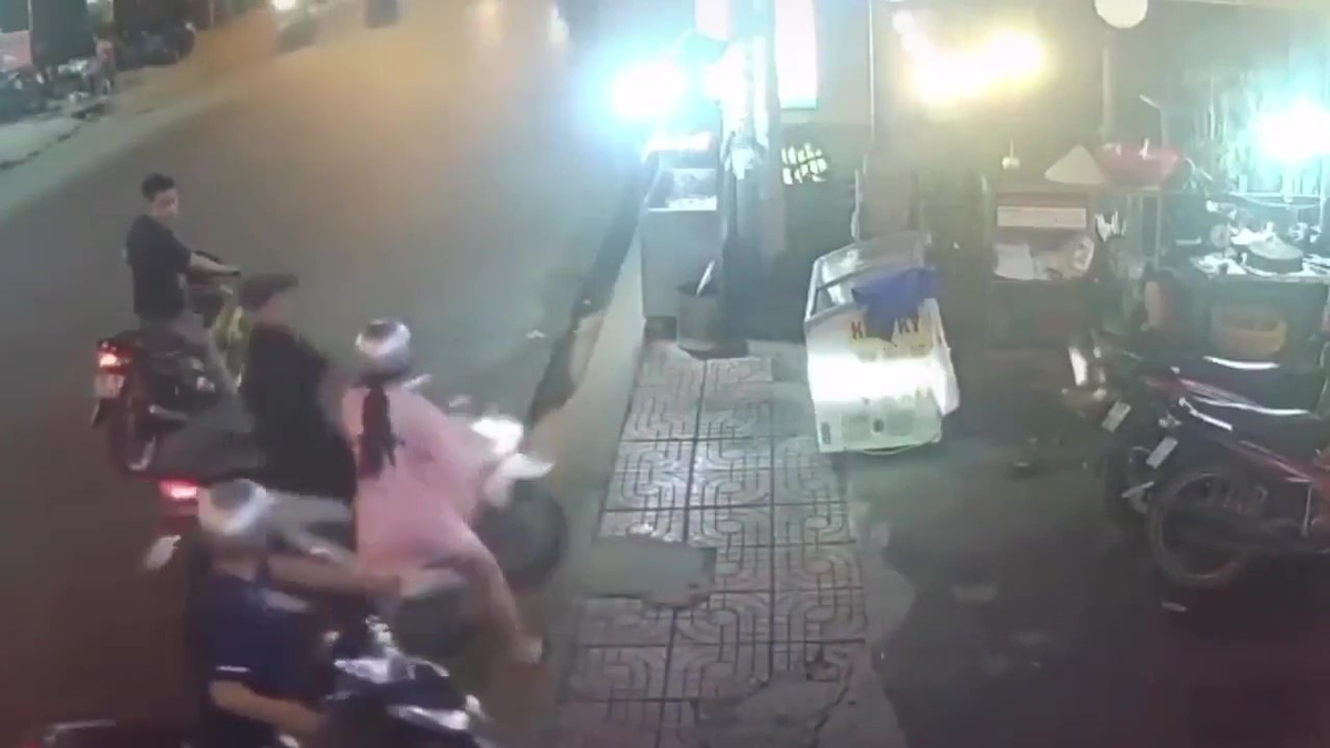 Đang yên đang lành, cô gái ngứa tay vặn ga chiếc xe chưa tắt máy, khiến anh chồng ngồi trên xe ngã chổng vó.