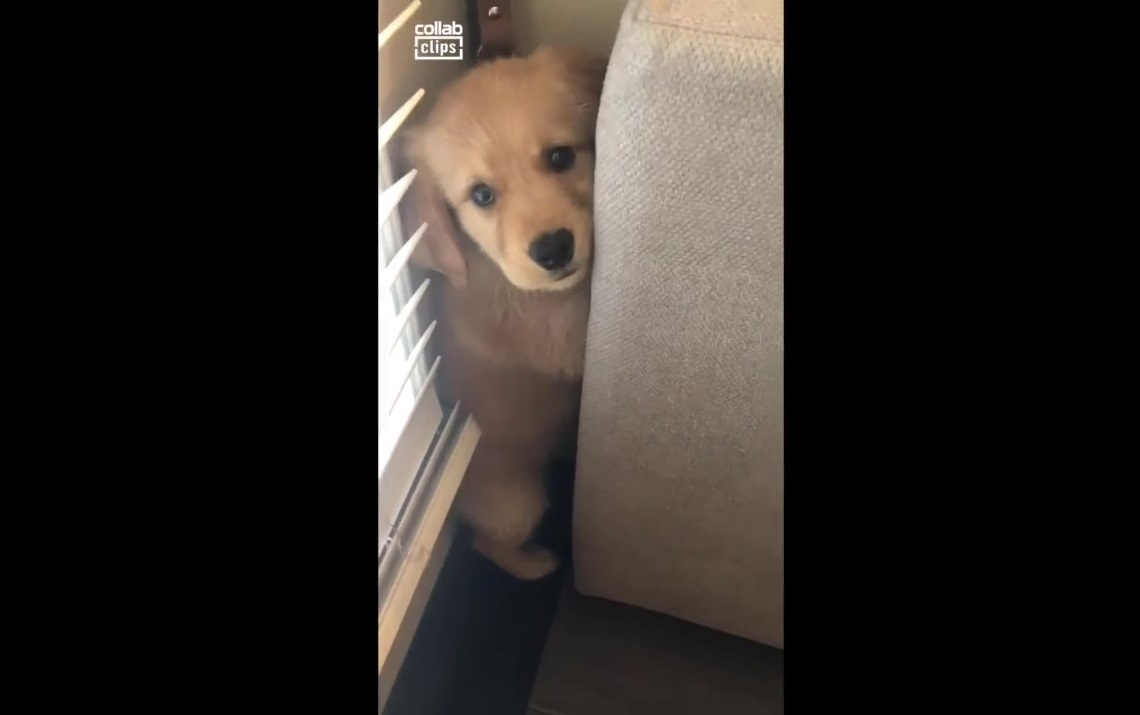 Nghe thấy tiếng máy hút bụi, chú chó nép mình vào xó, phía sau cái ghế với vẻ mặt sợ hãi lo lắng trông cực đáng yêu.