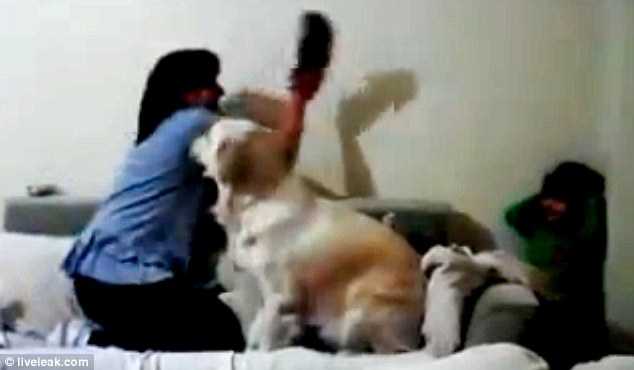 Đứa bé sợ hãi khóc lóc khi bị mẹ quát mắng và dọa đánh. Trong khi đó, chú chó trung thành sủa váng lên, thậm chí có lúc chú dùng hai chân trước để ngăn bà mẹ. Cuối cùng, bà mẹ ‘la sát’ cũng phải dừng tay trước sự kiên quyết của chú chó.