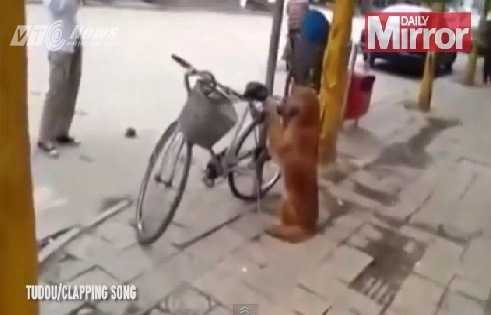 kiên quyết đứng bên bảo vệ chiếc xe đạp của chủ và ngồi phía sau xe như người.