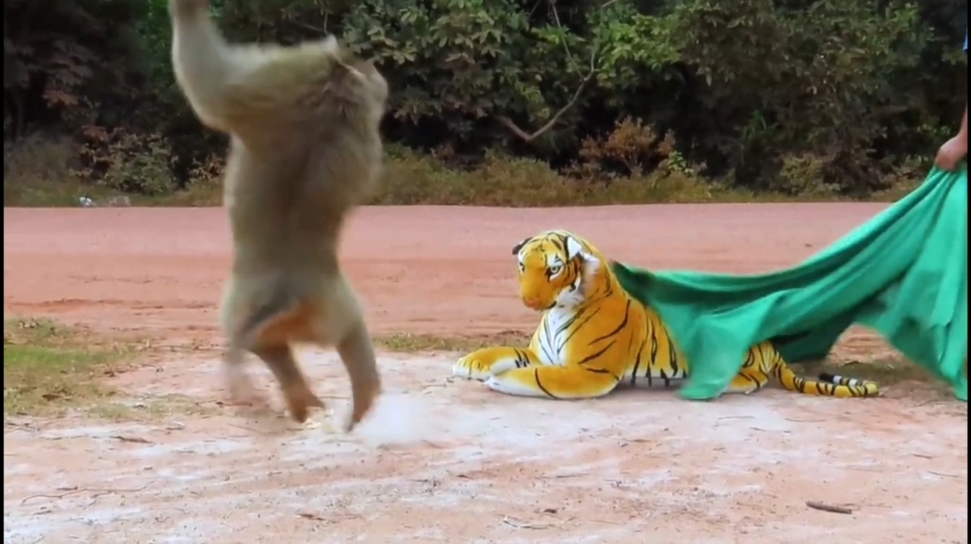 Clip: Chú khỉ tò mò nhảy dựng lên khi thấy hổ giả