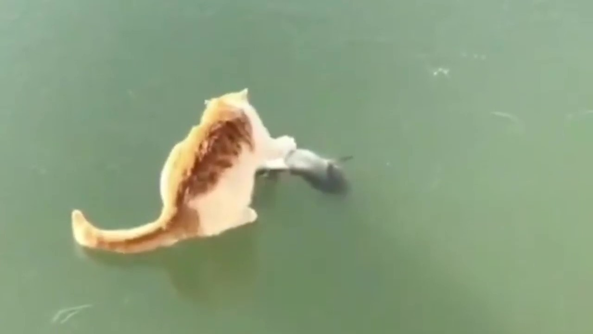 Clip: Chú mèo bất lực khi bắt cá trên sông băng