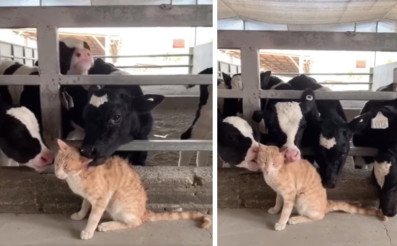 Trong clip được chia sẻ trên mạng xã hội mới đây, một chú mèo vàng ngồi ngay cạnh chuồng bò; lũ bò ở phía trong thò cổ ra qua chấn song, đua nhau liếm láp đầu, cổ, thân hình chú.