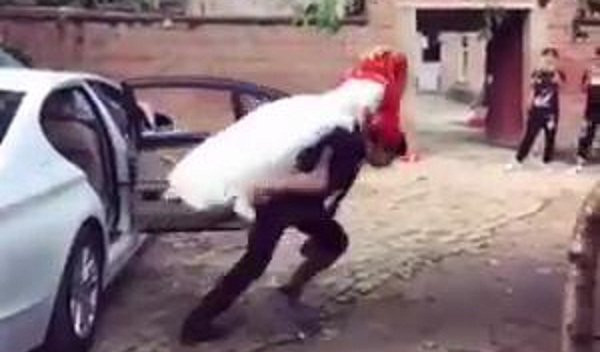 Chú rể nóng lòng cầm bó hoa tới cõng cô dâu ra khỏi xe nhưng mất đà chúi về phía trước khiến cả hai ngã sõng soài ra đất.