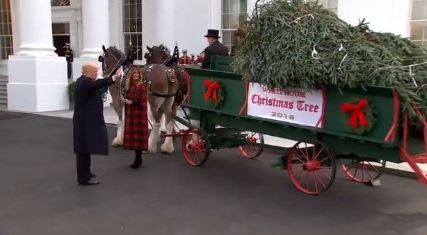 20/11/2018 12:21:00 +07:00Tổng thống Trump và phu nhân Melania đã tiếp nhận cây thông Fraser, cao gần 6 mét, được một đoàn xe ngựa kéo chuyển tới Nhà Trắng.