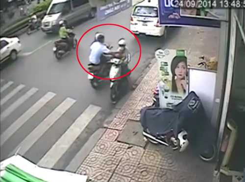 Cô gái đi xe tay ga đang đậu dưới lòng đường, bất ngờ hai tên cướp đi xe máy đến đưa tay giật sợi dây chuyền vàng trên cổ.